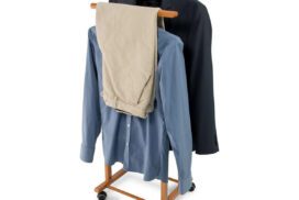 Материалом для данной модели стал массив бука, придающий вешалке дополнительную прочность и экологичность. Конструкция модели представляет собой сдвоенную вешалку, на одной части которой размещены широкие плечики для хранения рубашек и пиджаков, а вторая часть оснащена перекладиной-полочкой для хранения брюк или аксессуаров. Вешалка для одежды установлена на четыре прочных колесика, обеспечивающие легкость передвижения. Сами колесики защищены прорезиненным покрытием, предохраняющим покрытие пола от царапин.